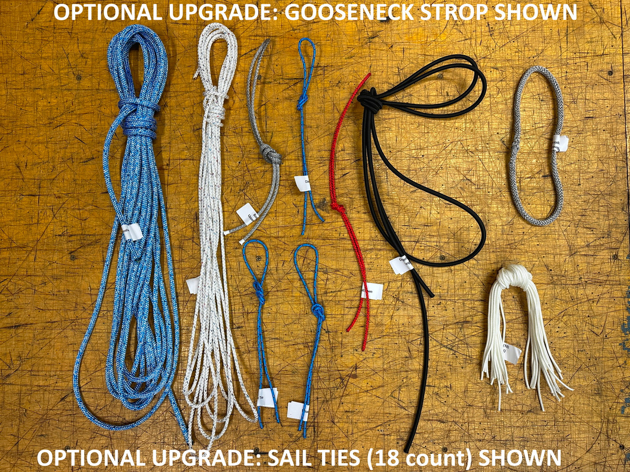 | Description Mainsheet Main Halyard Boom to Upper Boom Gooseneck Strop - optional Head Tie Clew Tie Tack Tie Rudder Pull Down Daggerboard Bungee Sail Ties (18) - optional |