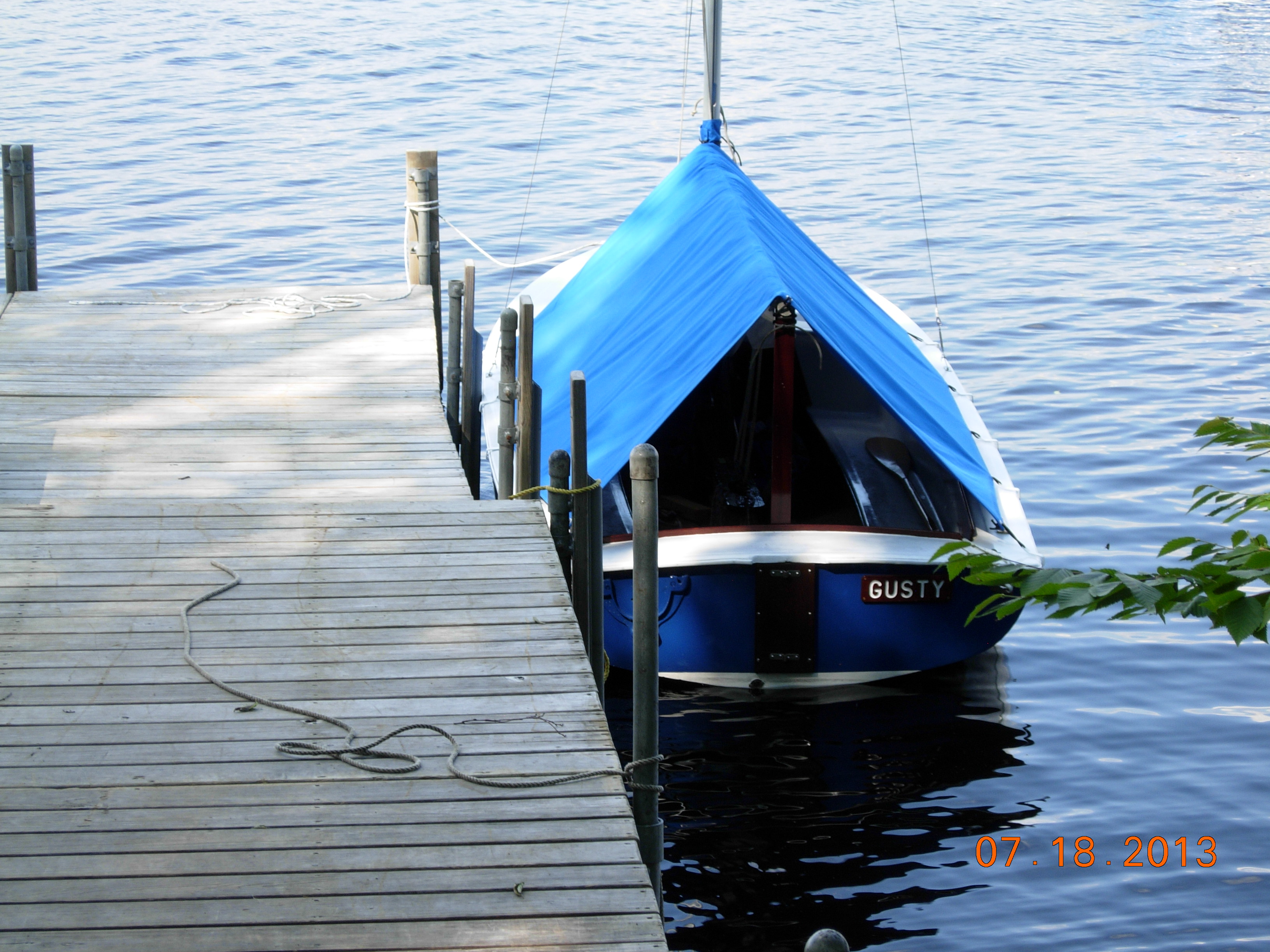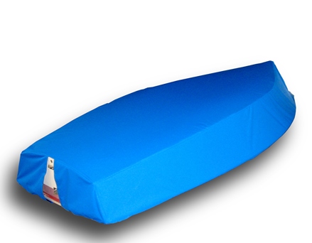 This cover is designed to be used when the mast and rigging are removed from the boat and can be used when trailering. The photo below shows a flat cover, which depending on the boat, may have webbing loops in the middle to help you support the middle of the cover in order to promote drainage. As a rule, these covers do not have any type of cutout in them. The deck cover is held on with a 1/4" bungee that runs through the hem of the cover. Webbing loops approximately every 3 feet around the cover also come standard which allow you to securely tie the cover to either the boat or trailer.