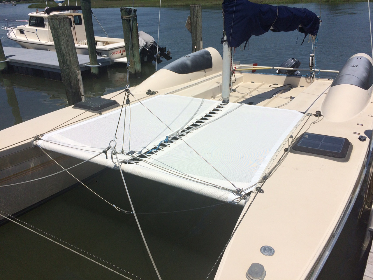 This listing is for a 2 piece Ferrari 392 Precontraint mesh trampoline to fit a Stiletto catamaran - available in white or black.
