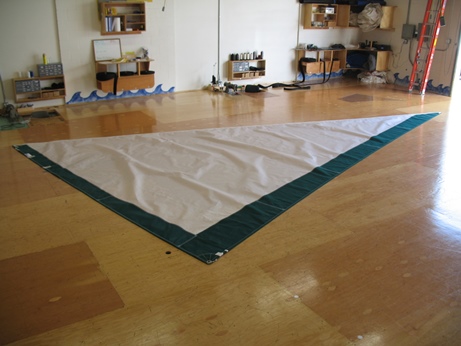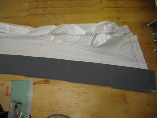 The panels of the UV cover material, in this case gray Sunbrella, are cut in varying widths, tapering from the clew to the head. This ensures that the sail is covered fully but there is no excess weight on the sail.